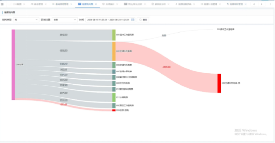 7)能源管理:系统支持以桑基图形式直观展示校园能源流向情况,结合智能计量设备实时监测各区域能耗情况。支持以区域及时间范围条件进行筛选展示。